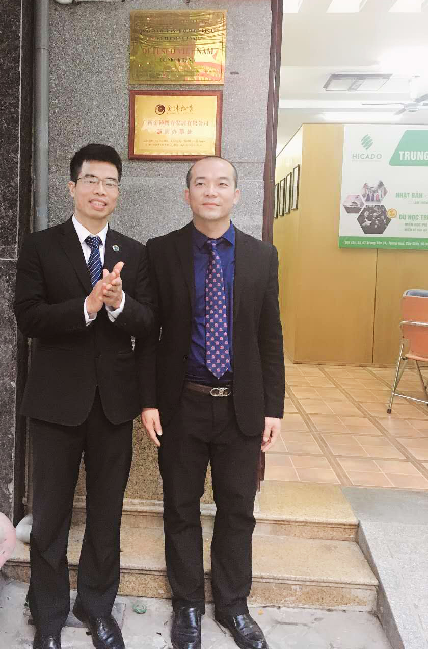 廣西金沛教育執行董事粟宥朝(右一)與越南HICADO公司執行董事阮功成(左一)共同揭牌