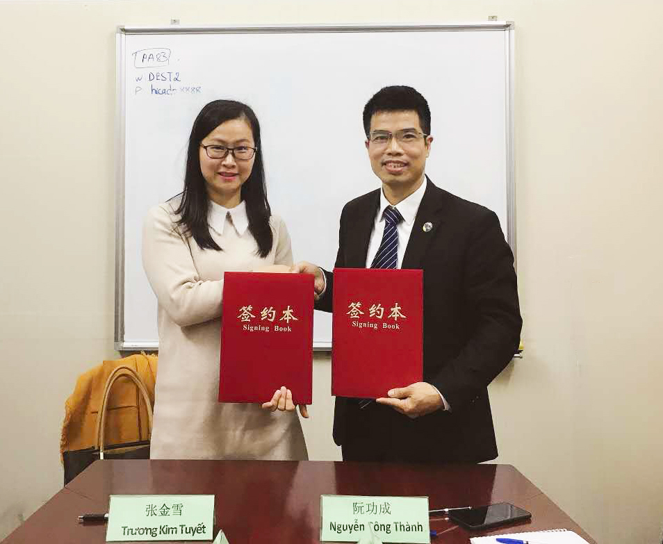 廣西金沛教育校長張金雪(左一)與越南HICADO公司執行董事阮功成(右一)簽署協議