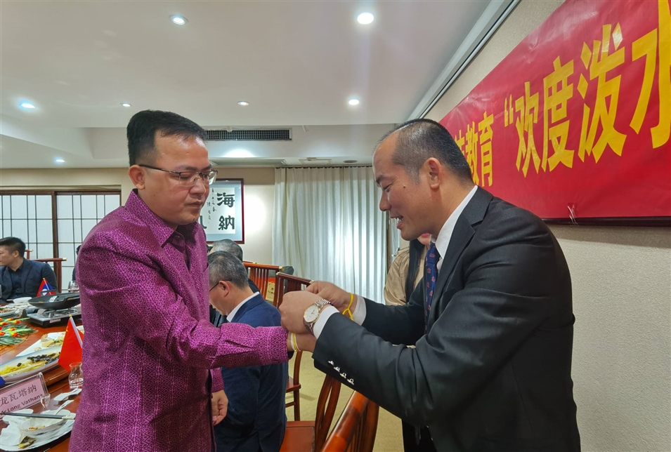 (老撾駐南寧總領事館總領事維拉薩宋蓬先生為致公黨廣西區委秘書長兼辦公室主任李永政先生栓線禮節)