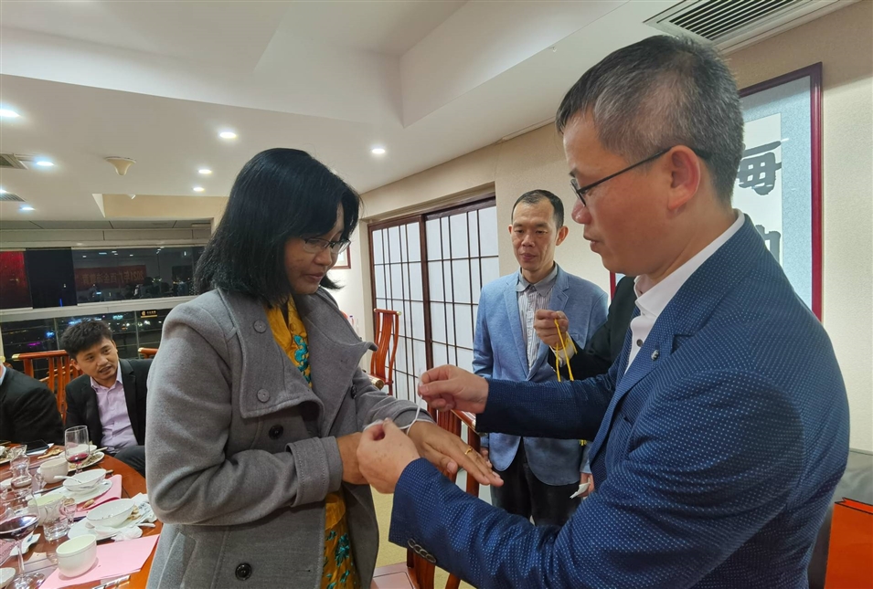 (廣西金沛教育執行董事粟宥朝先生為緬甸駐南寧總領事館領事佳吉文女士潑水禮節)