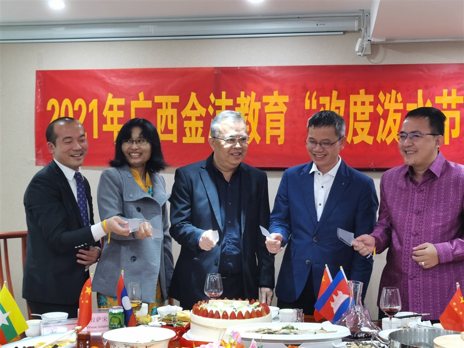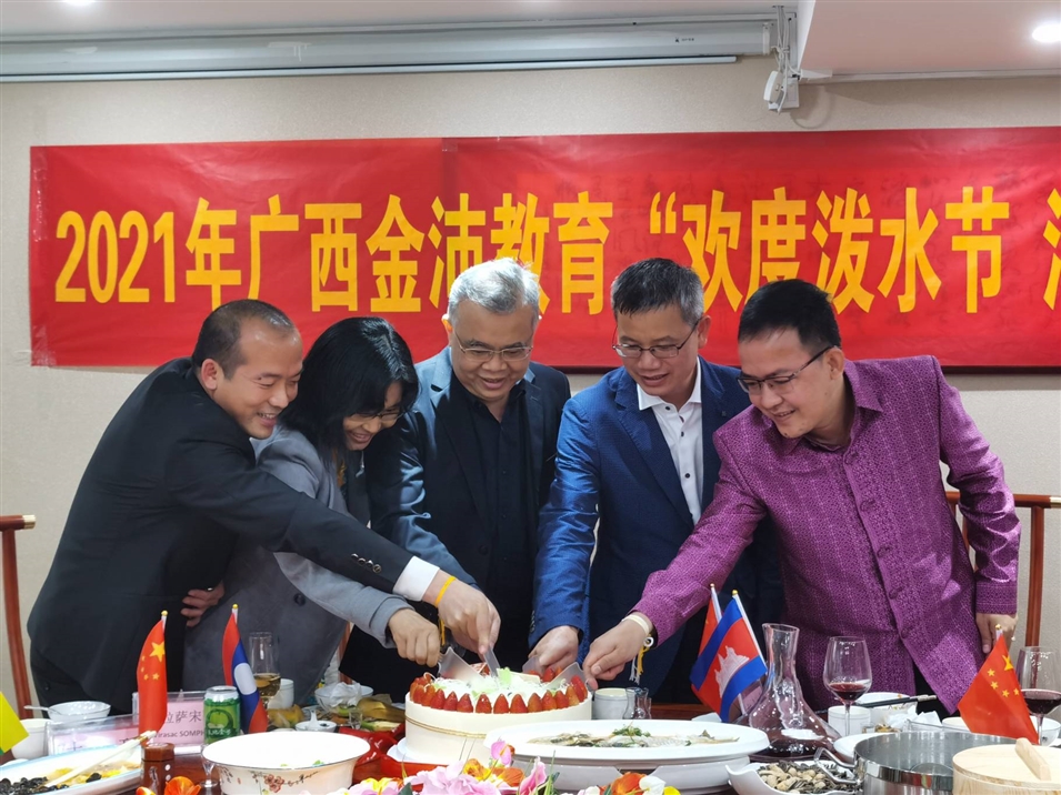 (老撾駐南寧總領事館總領事維拉薩宋蓬先生、柬埔寨駐南寧總領事館領事龍瓦塔納先生、緬甸駐南寧總領事館領事佳吉文女士、致公黨廣西區委秘書長兼辦公室主任李永政先生、廣西金沛教育執行董事粟宥朝先生共切潑水節及中國共產黨成立100周年蛋糕)