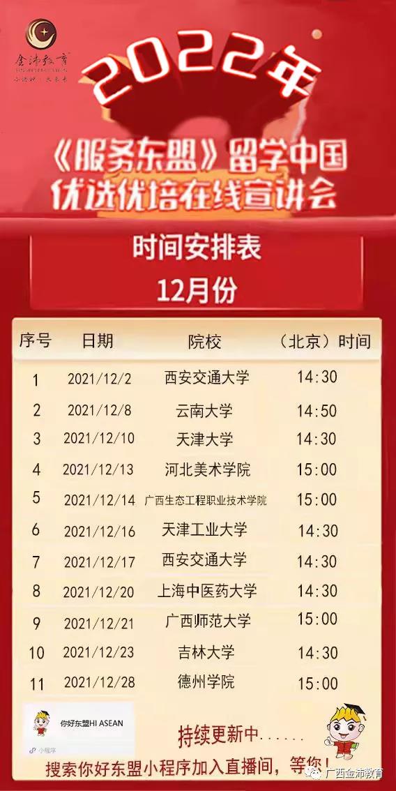 2021年12月2日起,由我司聯合多所高校開展的“2022年留學中國優選優培線上直播宣講會”將積極利用直播新形勢在“你好東盟”微信小程序上進行開播。學校和師生、家長可通過小程序你好東盟、Facebook和Youtube直播等多種途徑收看本次宣講會。