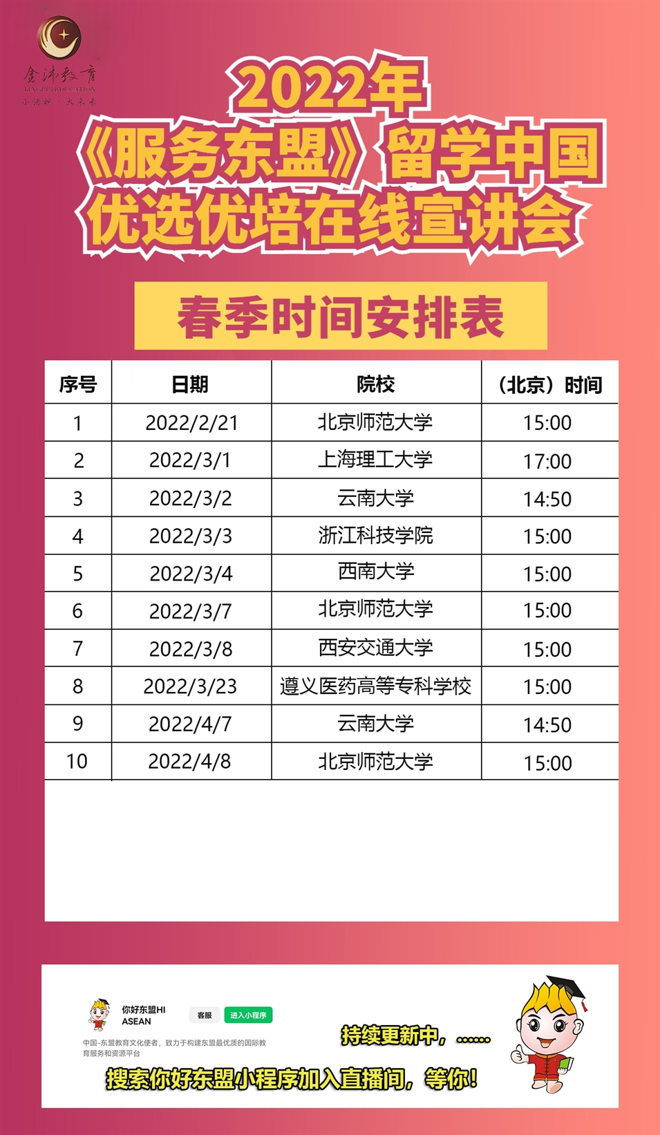 2022年2月21日起由我司聯合多所高校開展的“2022年春季留學中國優選優培線上直播宣講會”將在“你好東盟”微信小程序上進行開播。
