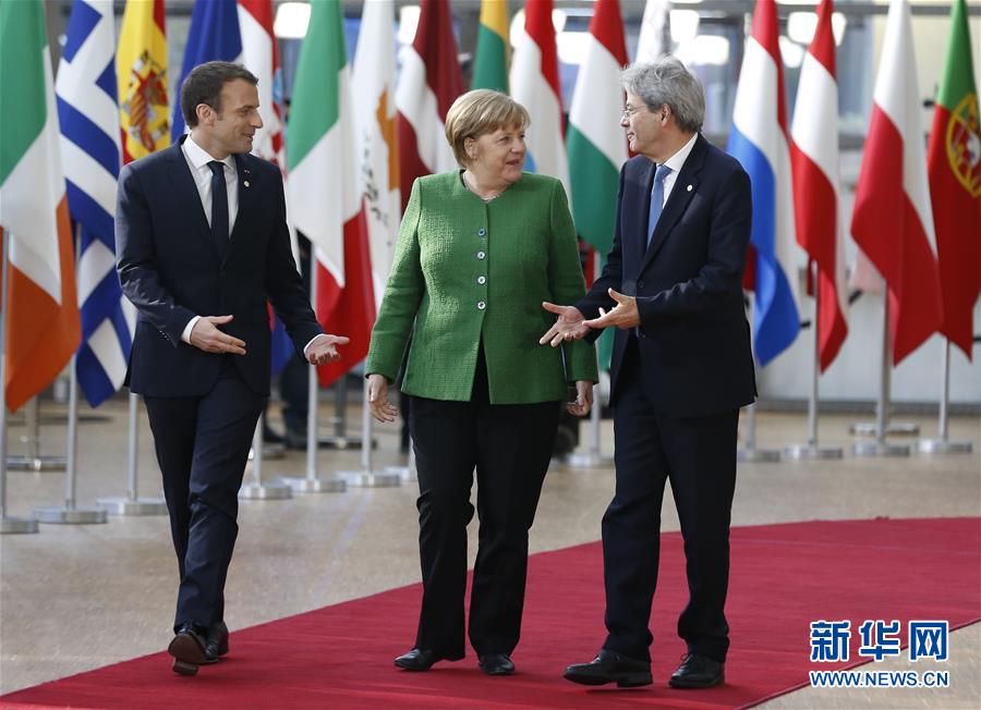 2月23日,在比利時首都布魯塞爾,法國總統馬克龍(左)、德國總理默克爾(中)和意大利總理真蒂洛尼抵達峰會會場。