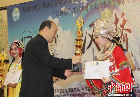 肖千為獲得大學組一等獎的選手頒獎并致辭。他說,“漢語橋”中文比賽已經走過了17個春秋,吸引了包括印尼在內的110多個國家的上萬名青少年參賽,成為國際人文交流領域的一大知名品牌。各國青年學生通過參加比賽,不僅提高了漢語水平,體驗了中國文化,而且向中國和世界人民展示了各自國家的獨特文化風采。