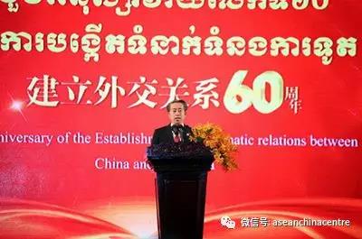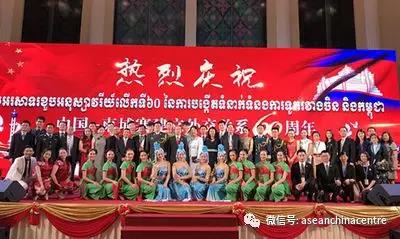 2018年7月2日,駐柬埔寨使館在金邊鉆石島會堂隆重舉辦中柬建交60周年紀念招待會。柬埔寨王國政府首相洪森及夫人文拉妮、5位副首相、柬王室帕花黛薇公主、柬中友協主席艾桑奧、國務兼外交大臣布拉索昆等20余位政府部長、有關國家駐柬使節、華僑華人代表以及各界友好人士500余人出席。