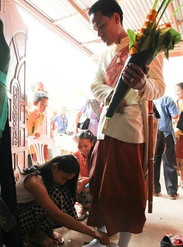 老撾婚禮中有一個(gè)很重要的儀式,老撾語稱“女婿游行”。即婚禮當(dāng)天,新郎按傳統(tǒng)風(fēng)格打扮,穿兜襠褲,配寶劍,手拿甘蔗和鮮花(象征保衛(wèi)愛情和創(chuàng)造甜蜜美好的新生活)前往新娘家。在距離新娘家還有一段距離時(shí),所有人必須下車,步行向新娘家走去。為體現(xiàn)男方家的誠意和身份,迎親隊(duì)伍會制造隆重?zé)崃业膱雒婧蜌夥眨宦非描尨蚬模Q放鞭炮,載歌載舞。