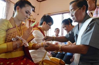與中國不同,老撾流行“倒插門”,即男方主動到女方家里做上門女婿。婚禮也是由女方家操辦,這與老撾女性的社會地位日益提高息息相關(guān)。