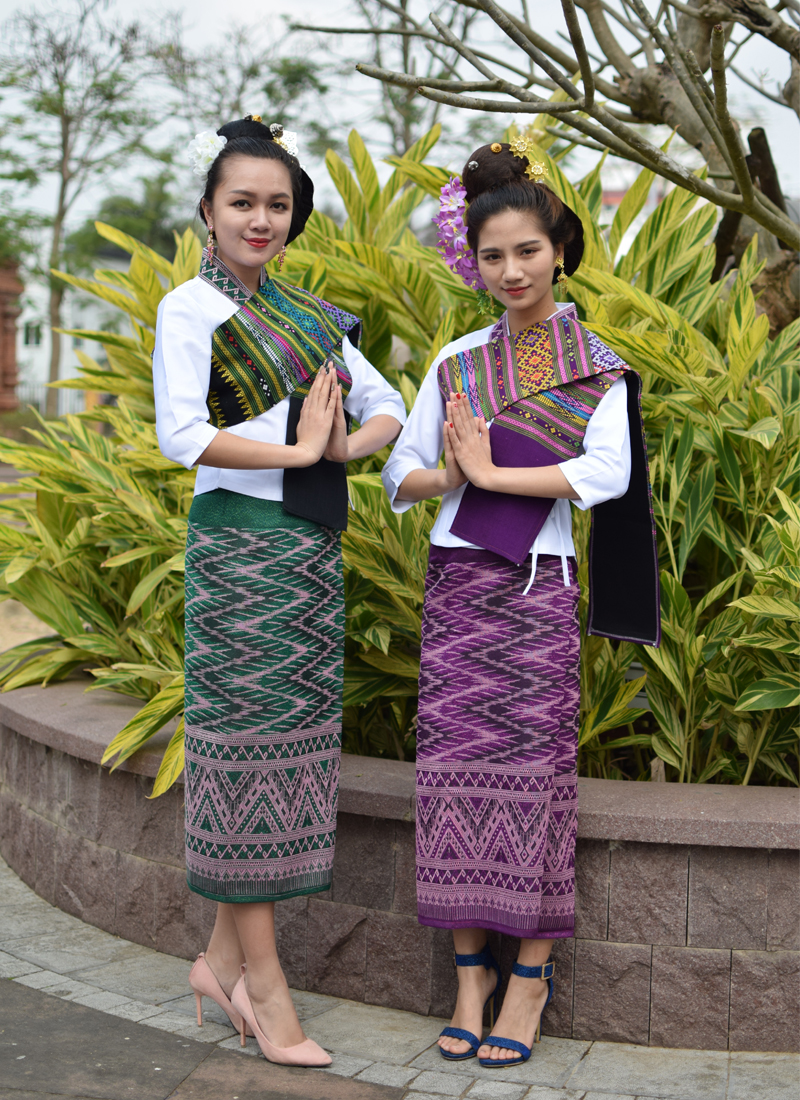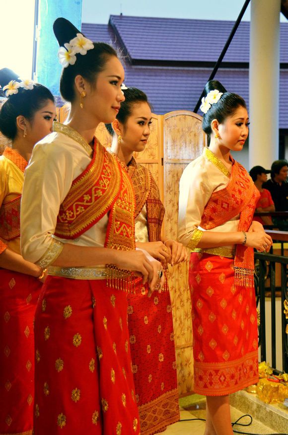 老撾女士一般都有多套正裝行頭,面料看起來明顯出自于手工紡織。女士的正裝色彩斑斕,配上做工考究的民俗圖案和珠璉佩飾,給人一種質樸、莊重的感覺。年輕女士的正裝顏色豐富,以鵝黃、桔橙、粉色、淡紫為主要色彩;中老年女士的正裝則青睞深紫、咖啡、墨綠、深藍等顏色。老撾人在集會時,一定會正裝出席,一改平日休閑、隨意的裝束。
