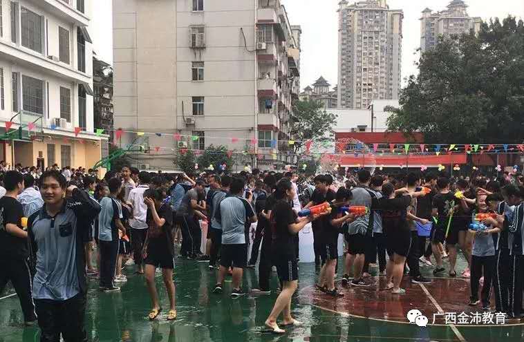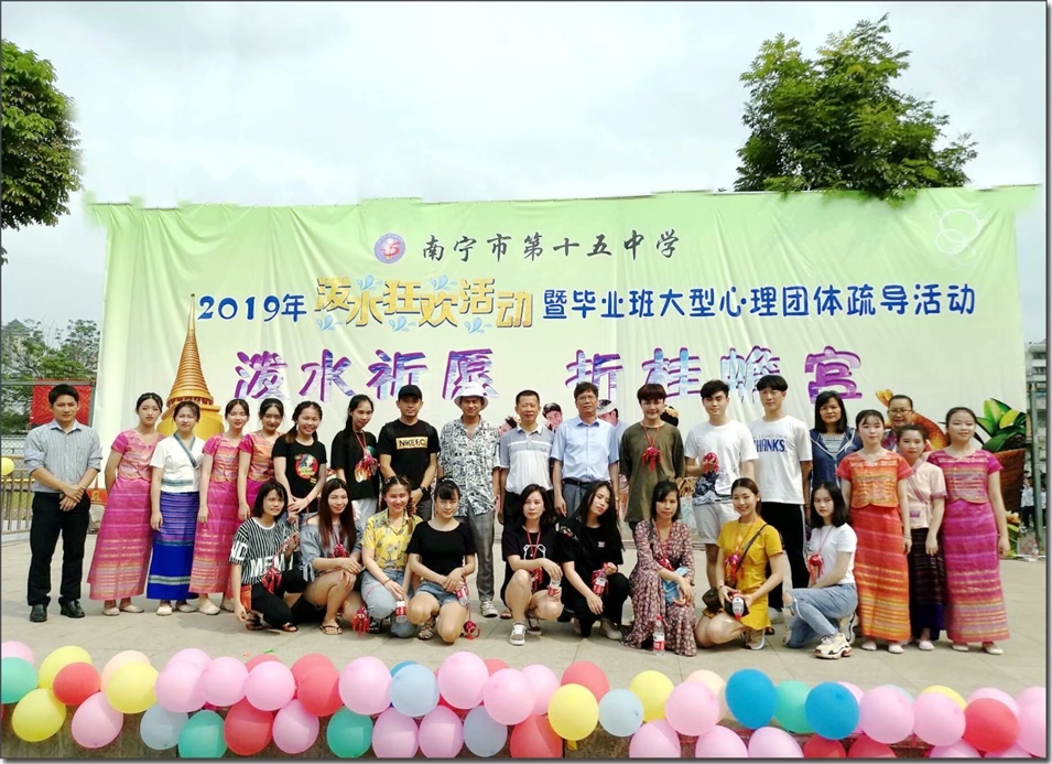 活動開始,高三學子進行“游龍翻身”的游戲,取“游龍翻身取金榜,十五中學我最棒”的含義。接下來身著東盟各國傳統服飾的學生為大家獻上了優美的東盟國家舞蹈,展現了東盟各國的傳統舞蹈的魅力。隨后由學校校長帶隊,各年級老師共同參與,手持水瓢,將滿載祝福的水輕灑向所有高三學子,拉開了潑水狂歡的序幕。伴隨著歡快的音樂,潑水狂歡將本次活動帶向高潮,大家積極參與,手持水盆、小桶、水槍,你追我趕,相互潑灑,傳遞著著祝福與歡樂。以多種形式將各國文化風情融入學生的心理教育中。
