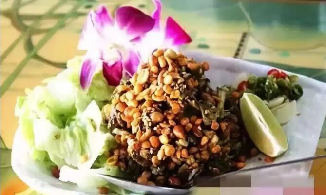 想要做這道菜,需要把酸且微苦的茶葉和撕成片的卷心菜、切片的西紅柿、炸得香脆的豆角、堅果和豌豆手藝混合在一同,再潑上蒜油,和切好的辣椒和大蒜。