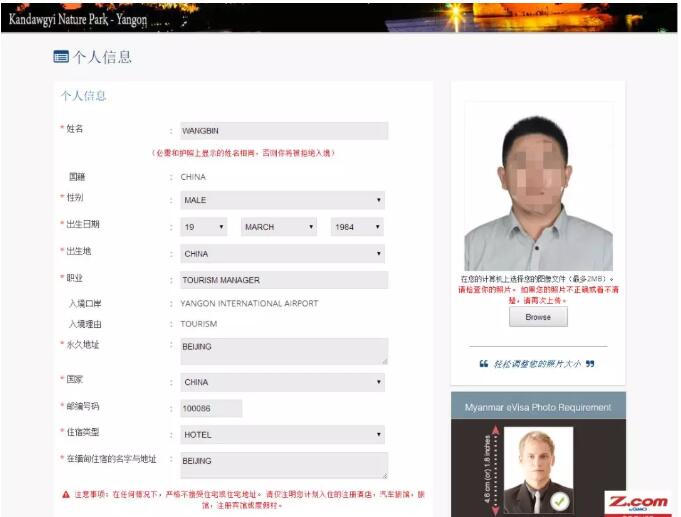 這是頁面的上半部分;比較簡單;名字;國籍;性別,出生日期;出生地,職業,這些都按照護照的信息填寫;常駐家庭地址;國家;郵編;在緬甸的入住酒店的類型;酒店,公寓,快捷酒店;之類的選擇;酒店的名稱;還沒有預定的話,就可以上網預定一個可以取消的那種;很多網站都可以在一定時間內取消酒店;預定一個,這些酒店信息就都有了;注意,照片不能大于2M哦;