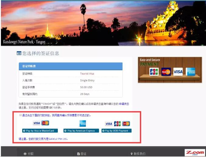 最后,要繳費了,顯示 旅游簽證,單次入境,簽證費50美金;停留28天;同意就付款;VISA
