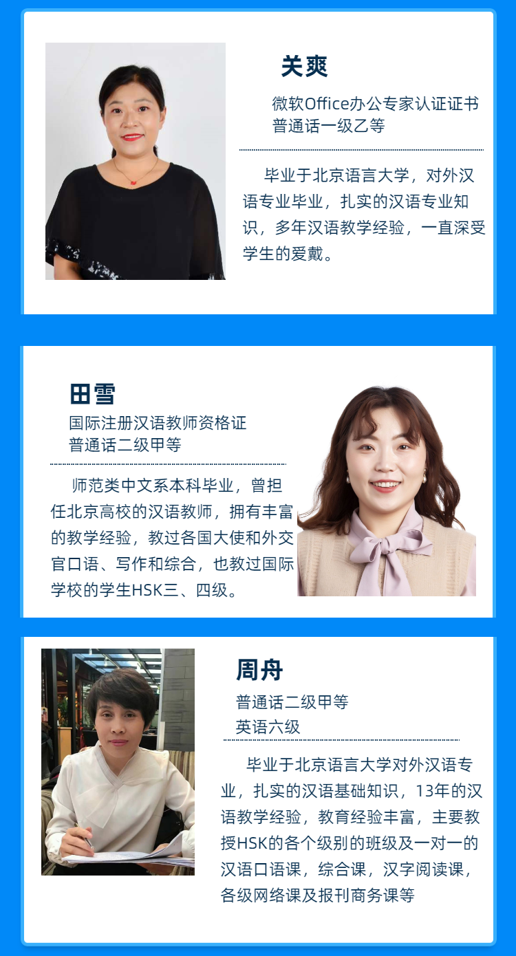 金沛漢語學院擁有雄厚師資力量和優秀的教師團隊,中國名校名師在線課堂,扎實的專業知識、漢語考試技巧、方向,根據學生目標,制定適合的教學計劃,助你順利過關!