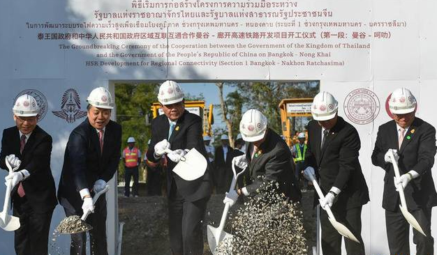 12月21日,泰國總理巴育(左三)與中泰鐵路合作聯委會中方主席、國家發改委副主任王曉濤(左二)等嘉賓們在泰國東北部呵叻府巴沖縣舉行的中泰鐵路合作項目一期工程開工儀式上共同鏟土。當日,中泰鐵路合作項目一期工程開工儀式在呵叻府巴沖縣舉行。李克強總理向開工儀式發來賀信。泰國總理巴育親臨現場致辭。中泰鐵路合作聯委會中方主席、國家發改委副主任王曉濤、中國駐泰國大使呂健,泰國交通部長阿空、內政部長阿努蓬,以及來自中泰政府部門、鐵路管理部門、相關企業、媒體等近400人出席開工儀式。新華社記者李芒茫攝