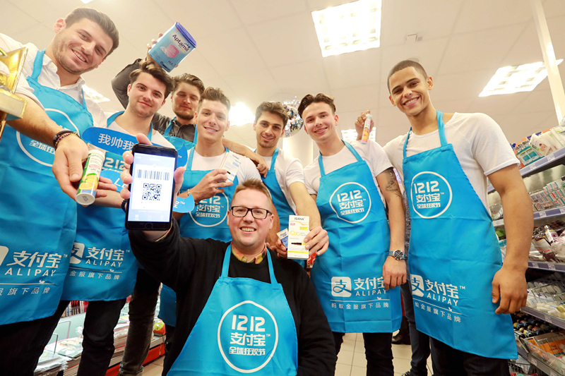 當地時間12月11日,德國“網紅”阿福(前排中)在法蘭克福市中心一家Rossmann日化連鎖為“雙12”促銷活動助陣。受到中國國內民眾歡迎的“雙12”購物狂歡今年由支付寶引入德國。