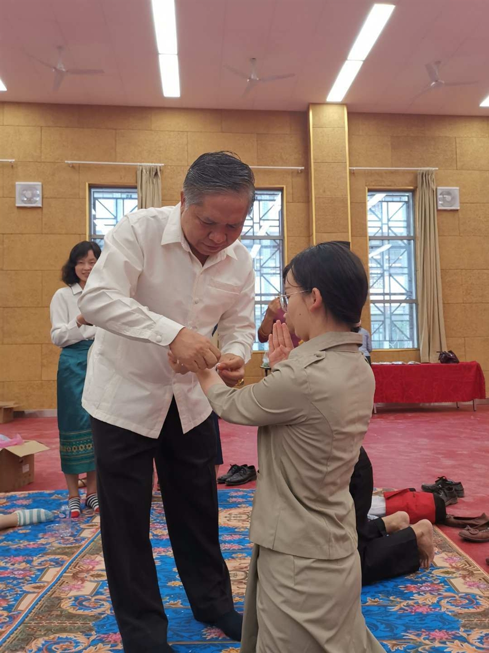 (老撾國立大學校長宋西.諾潘塞在給老師栓線祝福)