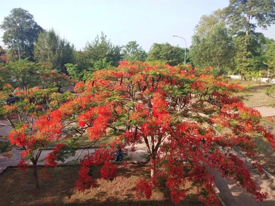 宿舍區有一片小森林,午后或者晚間,可以跟朋友一起散步,特別是炎熱的夏季,感受習習涼風,整個人神清氣爽,四月的宿舍樓下環境很迷人的,樹木長滿了紅花,就像火熱的天氣,好像在宣告著:夏天來了