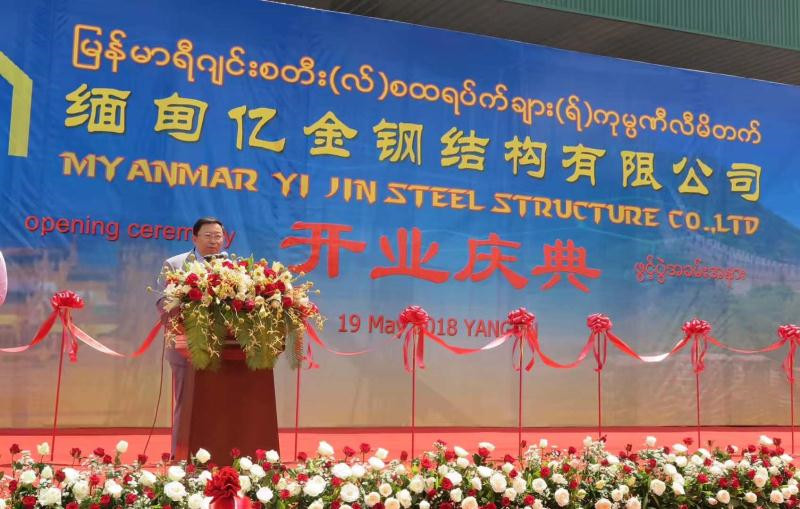 2018年仰光市,中國—東盟商務理事會執行理事長許寧寧應邀在緬甸億金鋼結構公司開業盛典上致辭:中緬企業增進合作、共同發展。該公司是中緬合資,是緬甸最大的鋼結構加工和安裝企業,承建了包括緬甸國家體育館、曼德勒商務與會議中心等多個標志性建筑。