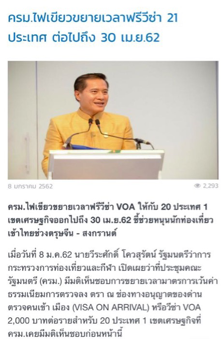 018年12月16日,泰國旅游業協會(ATTA)會長威奇曾表示,泰國旅游協會已向泰國旅游與體育部長和泰國旅游局提案,將落地簽免費政策延期3個月,以促使該政策延期至2019年第1季度,估計12月底將獲得答復。