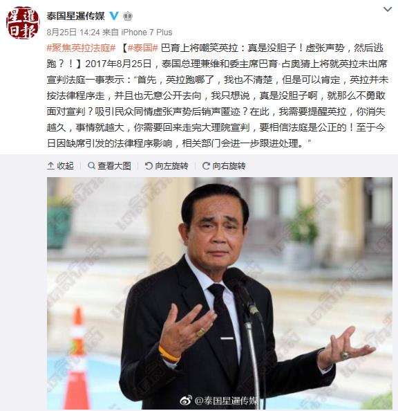 近日有網友在社交媒體facebook上分享了一張截圖照片,上邊可以看到泰國前總理他信和兩名女性站在英國倫敦高級商場Selfridges扶梯上。截圖的配文這樣寫道:“不敢相信,剛才竟然在Selfridges London遇到了前總理他信!!!中間這位女士一直沒回頭……”。報道稱,中間背對鏡頭的女性從發型、身高、體型來看,普遍認為就是銷聲匿跡已久的英拉。該消息并未得到泰國主流媒體的報道,大多在社交媒體上流傳。不久后泰媒援引泰國安全部新聞部門消息,稱在11月16日上述照片經過鑒定后發現,確認照片中的人就是英拉。英拉藏身英國倫敦,目前正在等待英國當局的答復,看是否會為英拉提供政治庇護。