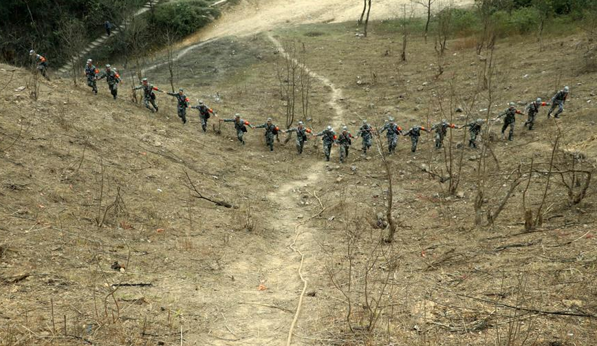 掃雷官兵手拉手走過完成清理的中越邊境廣西段某雷場(12月22日攝)。為了讓百姓放心,向地方政府交付雷場時,掃雷官兵將手拉手在作業完的雷場上來回走幾遍。 11月27日,中越邊境廣西段新一輪掃雷行動全面啟動。此次行動的主要任務是徹底掃除和封圍廣西邊境附近53處共計約205萬平方米的雷場。12月22日,記者隨南部戰區陸軍廣西西線掃雷隊,前往中越邊境某雷場,用照片紀錄排雷官兵清理雷區的驚險過程。