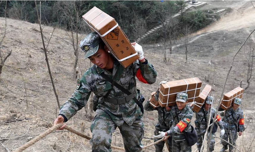 掃雷官兵在中越邊境廣西段某雷場搬運炸藥,準備爆破作業(12月22日攝)。掃雷官兵在作業前要對雷區進行爆破作業,清除雷場植被,方便后期搜排。