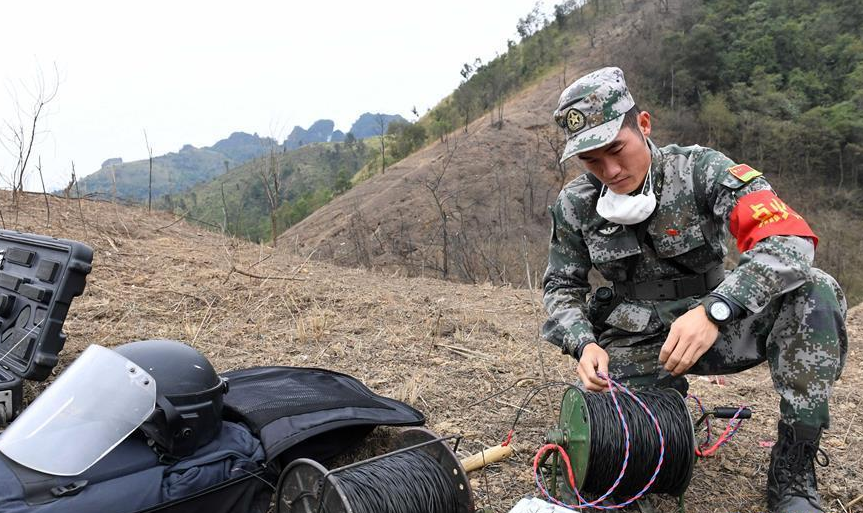 一名掃雷戰士在中越邊境廣西段某雷場檢查爆破線路